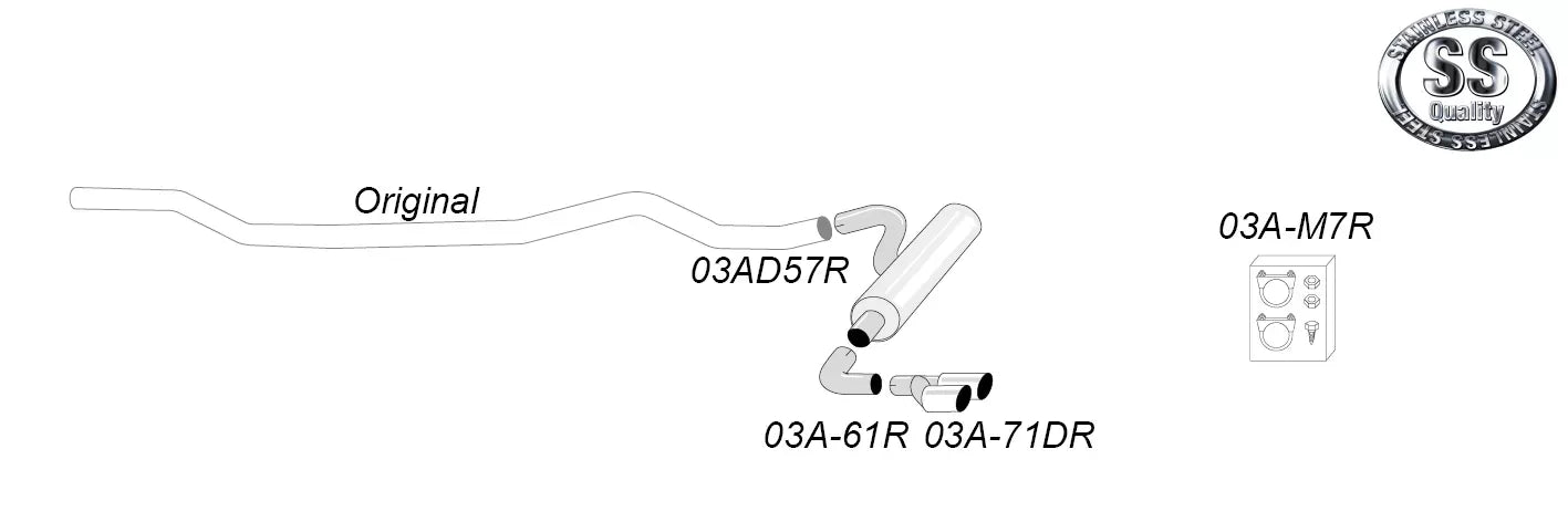 Med dubbla 80 mm ändrör och rördiameter på 70 mm + 63,5 mm ger systemet ett sportigare utseende och förbättrat ljud. För korrekt montering behöver stötfångare eller diffusor bearbetas eller bytas ut.