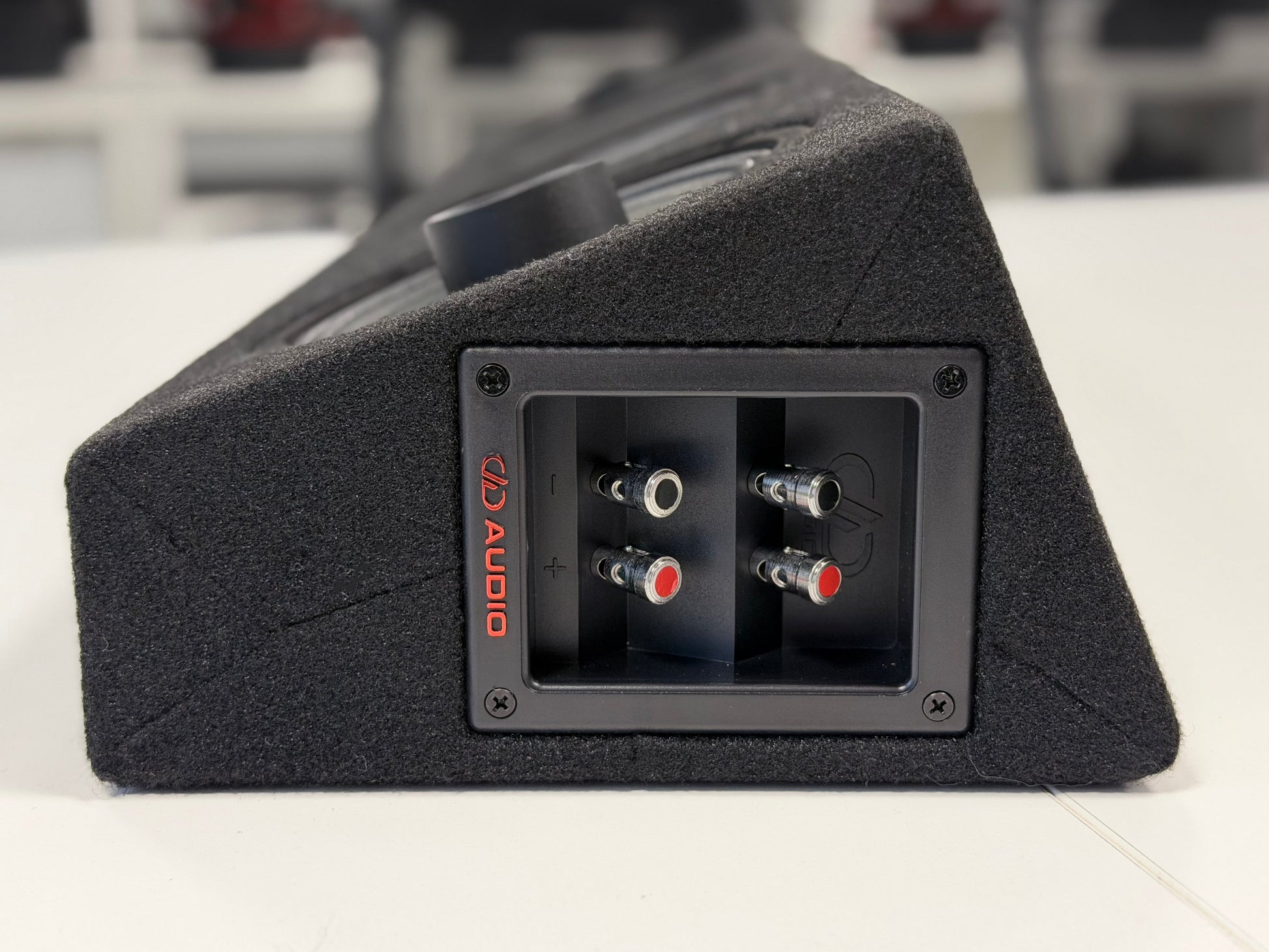 På sidan finns dubbla push-terminaler för enkel och säker inkoppling. Trots sitt kompakta format (900 x 260 x 165 mm) är lådan byggd för att tåla extrema ljudnivåer.