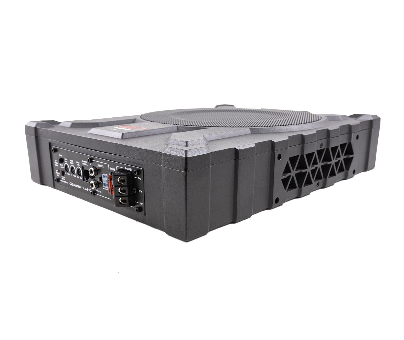 DD Audio RL-AE10 är en slim aktiv 10″ subwoofer som ger massiv bas även där utrymmet är extremt begränsat. Den integrerade förstärkaren levererar 200W RMS (700W peak) och driver en robust 10″ aluminiumkon-subwoofer tillsammans med två passiva radiatorer, vilket ger ett djupare och kraftigare bastryck utan behov av en stor låda.