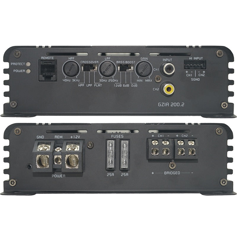 Tack vare High-Level Input med auto-on-funktion fungerar GZIA 200.2 även smidigt ihop med originalstereo utan extra tillbehör. Förstärkaren är byggd med stabil strömförsörjning, kraftiga anslutningsterminaler och en svart anodiserad kylfläns med Ground Zero-logo för hållbarhet och stilren design.