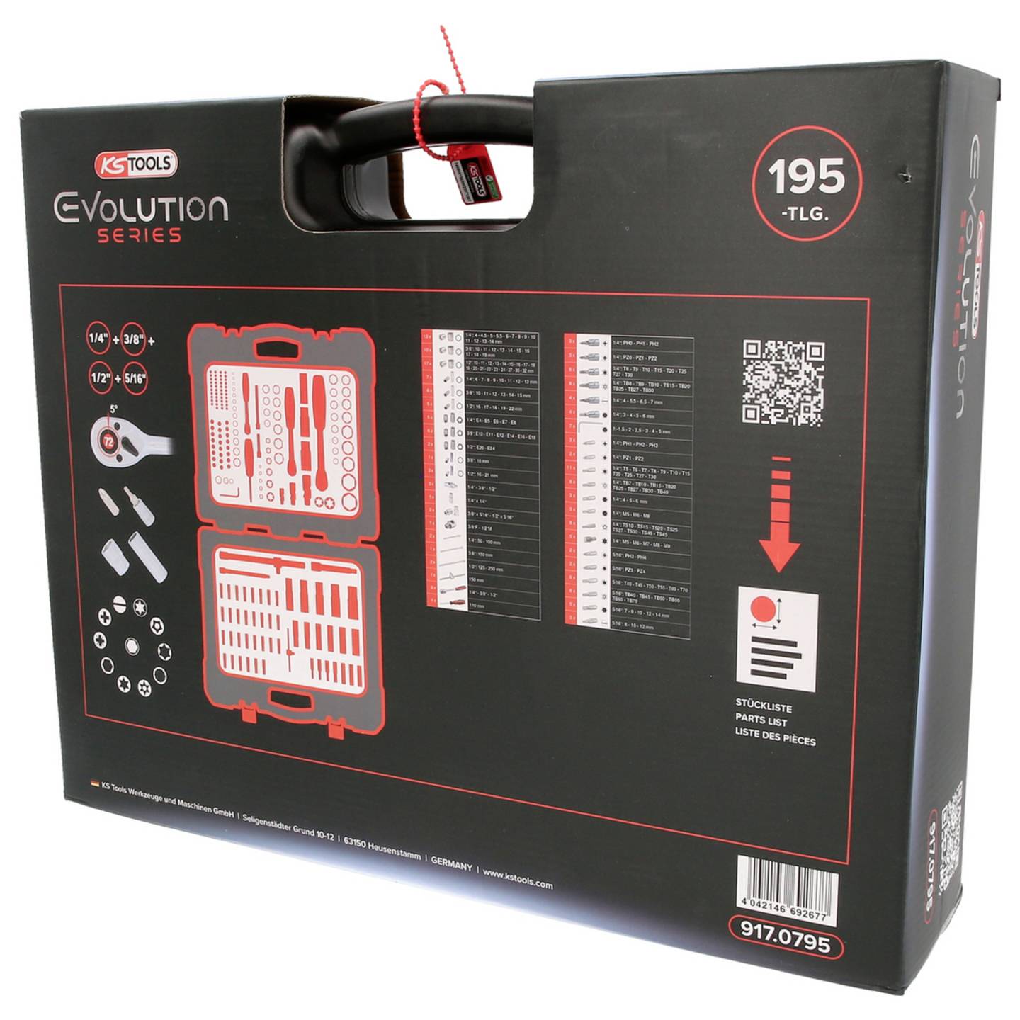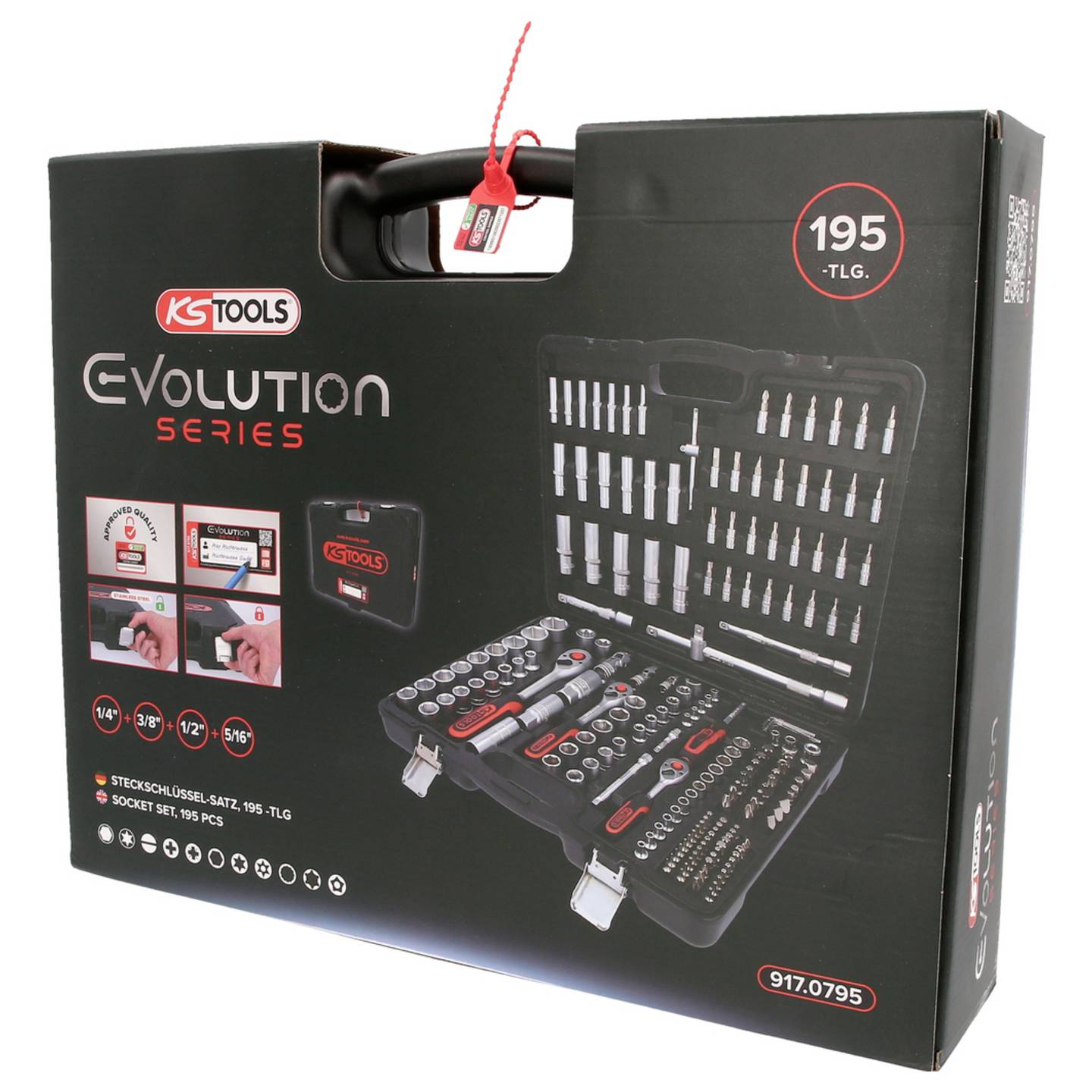En komplett och professionell hylsnyckelsats från KS Tools med hela 195 delar. Denna sats täcker ett brett spann av användningsområden inom fordonsservice, industri och verkstad. Levereras i en robust plastväska och innehåller spärrskaft, hylsor, bits och tillbehör i tre olika drivstorlekar: 1/4", 3/8" och 1/2". Ett utmärkt val för både verkstäder och krävande hemmafixare.