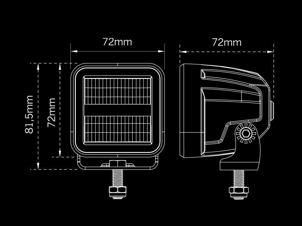 Extraljuset har robust konstruktion med hus i aluminium, hållare i rostfritt stål och lyktglas i polykarbonat, vilket garanterar lång livslängd och tålighet i tuffa miljöer. Produkten är IP69K-klassad och ECE R10-godkänd, vilket säkerställer hög skyddsnivå mot damm och vatten samt följer fordonsstandarder. Drifttemperaturen ligger mellan -30 °C och +65 °C, och anslutningen sker via DT-4 kontakt.