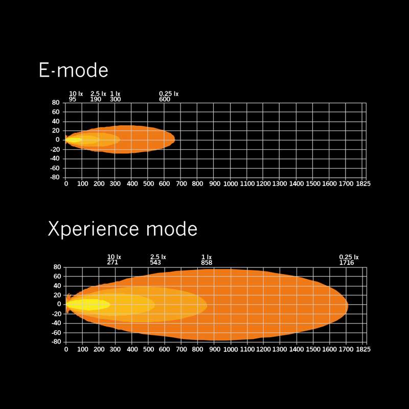 Kraftfull ljusbild med 300 m belysningsområde i E-läge och hela 858 m i Xperience-läge