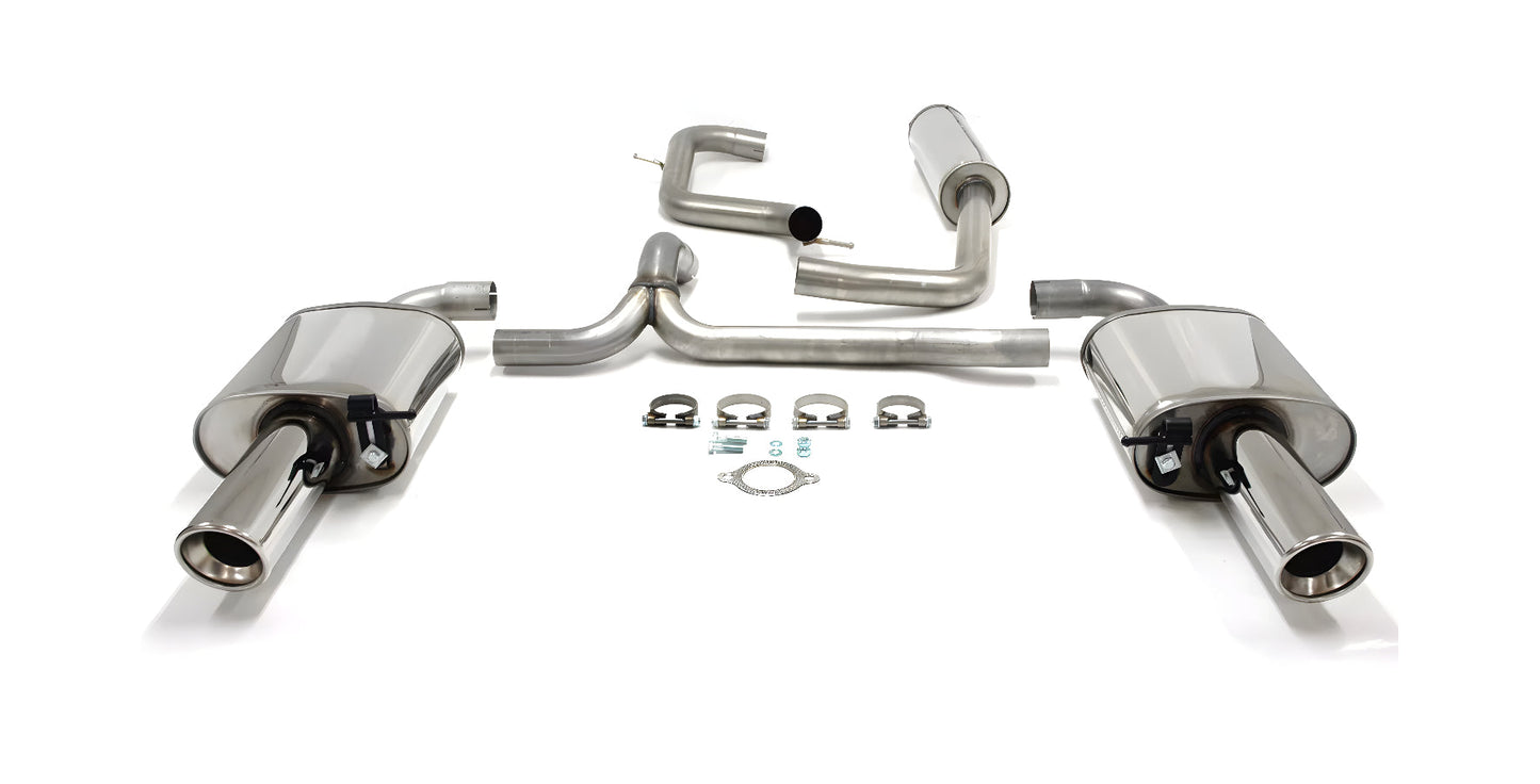 Avgassystemet har en huvudrördiameter på 63,5 mm som delas i två sekundära rör med 57 mm vardera, vilket optimerar gasflödet och förbättrar motorns respons. De dubbla ändrören i duplexutförande (100 mm + 100 mm) ger bilen ett sportigt och distinkt utseende, samtidigt som de är justerbara i höjdled för att passa fordon med eller utan uttag i diffusorn.
