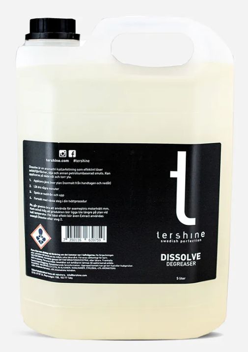 Tershine Dissolve är en högpresterande, aromatfri kallavfettning som effektivt löser upp asfaltstänk, olja, fett och annan petroleumbaserad smuts från fordonets nedre partier, motorutrymmen och andra utsatta ytor. Formulan är framtagen med fokus på säkerhet och skonsamhet, utan att kompromissa med rengöringskraften. Produkten är nästan helt luktfri, icke brandfarlig och därmed ett utmärkt val för både entusiasten och proffsverkstaden.
