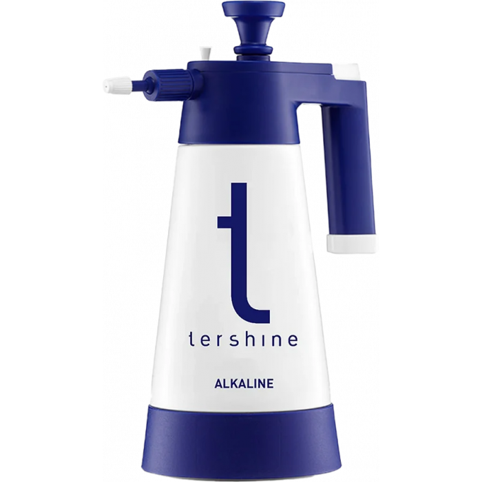 Tershine Spraypump Alkaline är en robust och kemikalieresistent tryckspruta utvecklad för professionell och effektiv applicering av alkaliska rengöringsmedel. Med en kapacitet på 1,5 liter är den idealisk för användning av produkter med pH-värden mellan 7 och 14, vilket gör den särskilt lämplig för exempelvis avfettningsmedel, fälgrengöring och andra kraftfulla rengöringslösningar.